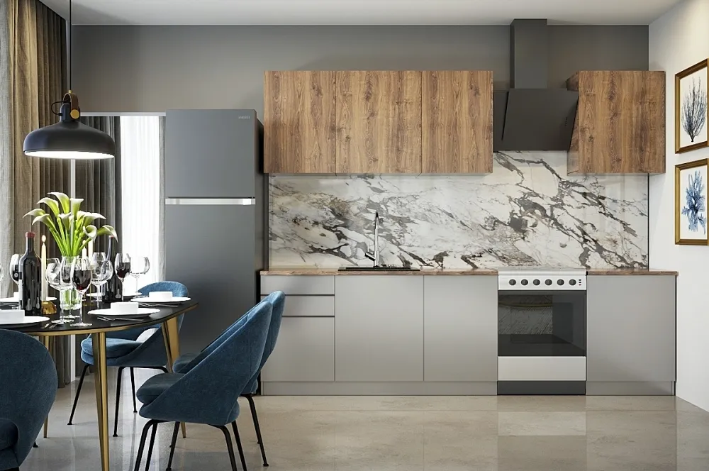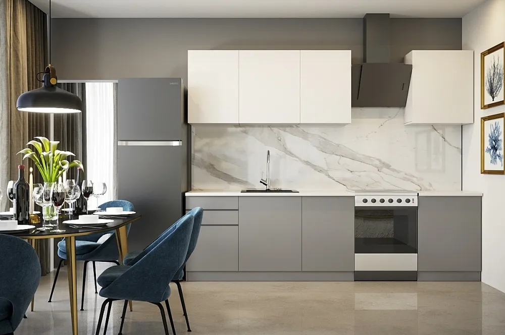 Ручки, столешница, стеновая панель, мойка, смеситель и бытовая техника продаются отдельно.